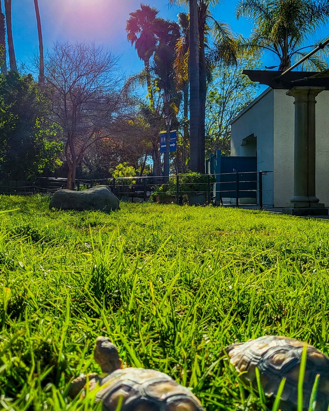 Alt-text: A pair of small desert tortoises crawl through the bright green grass on the lawn behind the Zoo’s Discovery Pavilion on a sunny day.