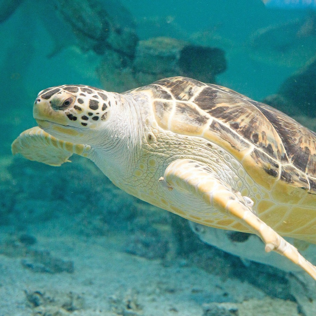 The green sea turtle (Chelonia mydas) is listed as endangered by the International Union for Conservation of Nature (IUCN). This species is primarily threatened by pollution, poaching, and climate change, affecting their nesting sites and food availability. Housing green sea turtles at the Aquarium allows researchers to study their behavior and physiology, informing conservation strategies and public education.