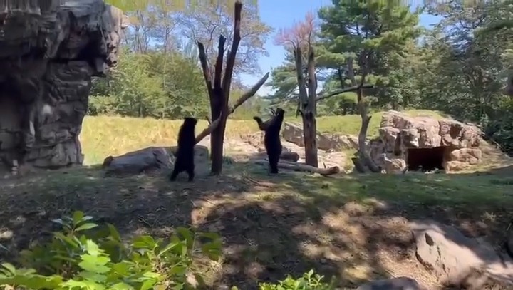 Bears that play together, stay together! In September, we shared that we had welcomed a new male Andean bear, Ransisku, to the Queens Zoo and introduced him to our young female Andean bear, Coya. This video shows the two young bears getting along very well and engaging with a climbing structure in their habitat. Watch them use the large log like a seesaw! The wood structure also provides the bears with a place to scent mark, chew, scratch, climb, and explore.