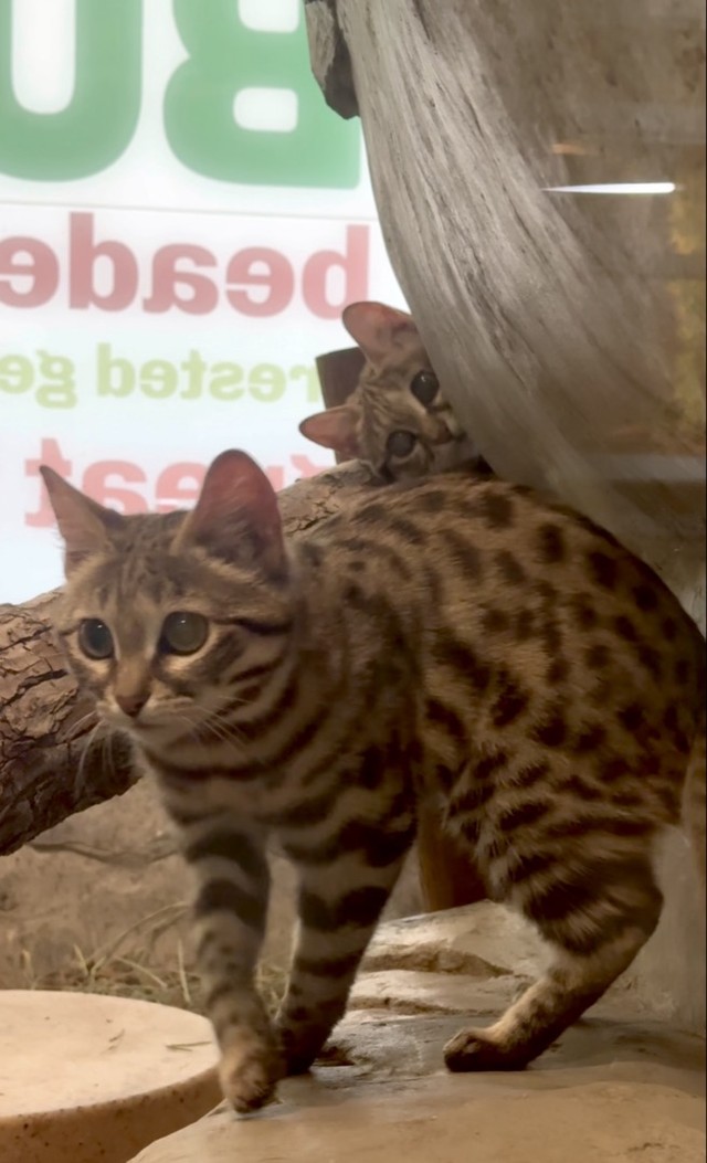As they settle into their new habitat, they can often be found napping, pouncing, exploring, and engaging with enrichment. Thelma is bold and playful, while Louise is a little more reserved—cautiously curious and content to observe before leaping into the action. Together, they roll, chase, and tumble through their space.