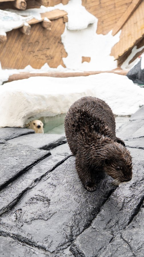 Otters are social animals with structured group dynamics. Mocha’s supervision of Bennett as he explores represents a natural behavior where older, more experienced otters guide juveniles. This social learning is crucial for young otters, as they acquire vital skills for survival.