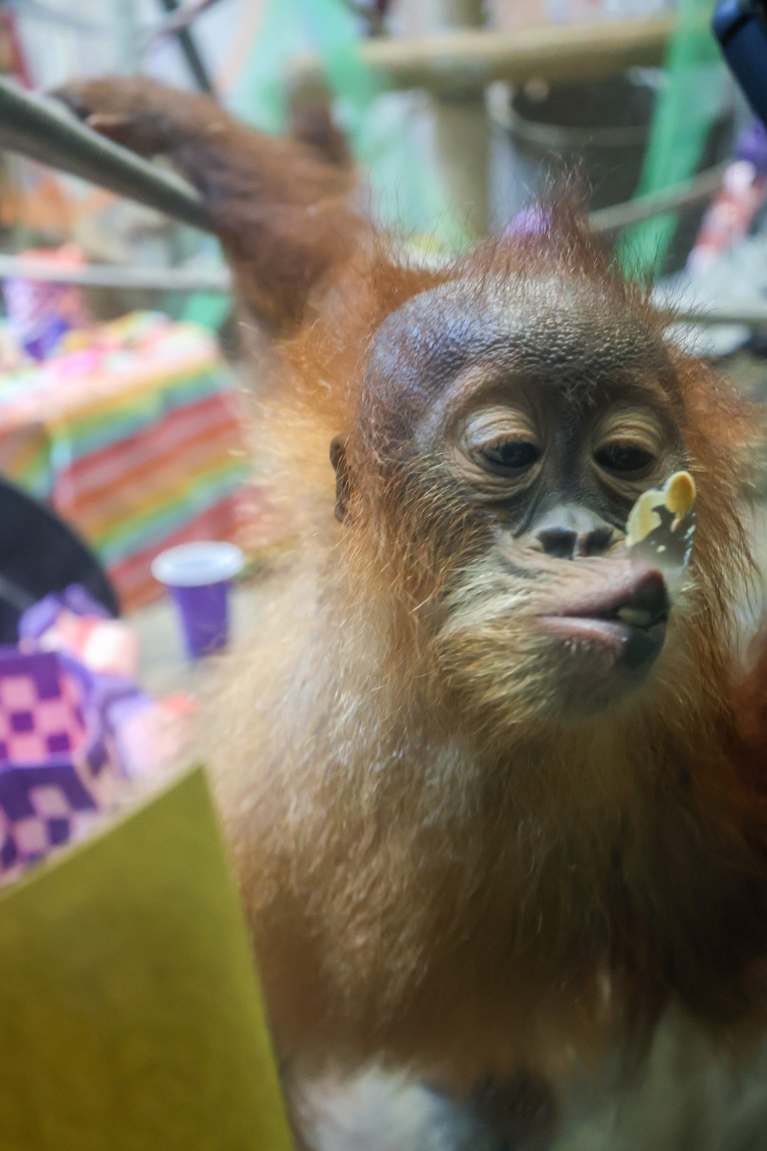 To celebrate Siska’s 2nd birthday, her Animal Care team turned her habitat into a party wonderland, complete with tropical fruits, colorful streamers and paper chains, and cozy blankets for nesting. Just like any toddler, she wasted no time diving into the fun!