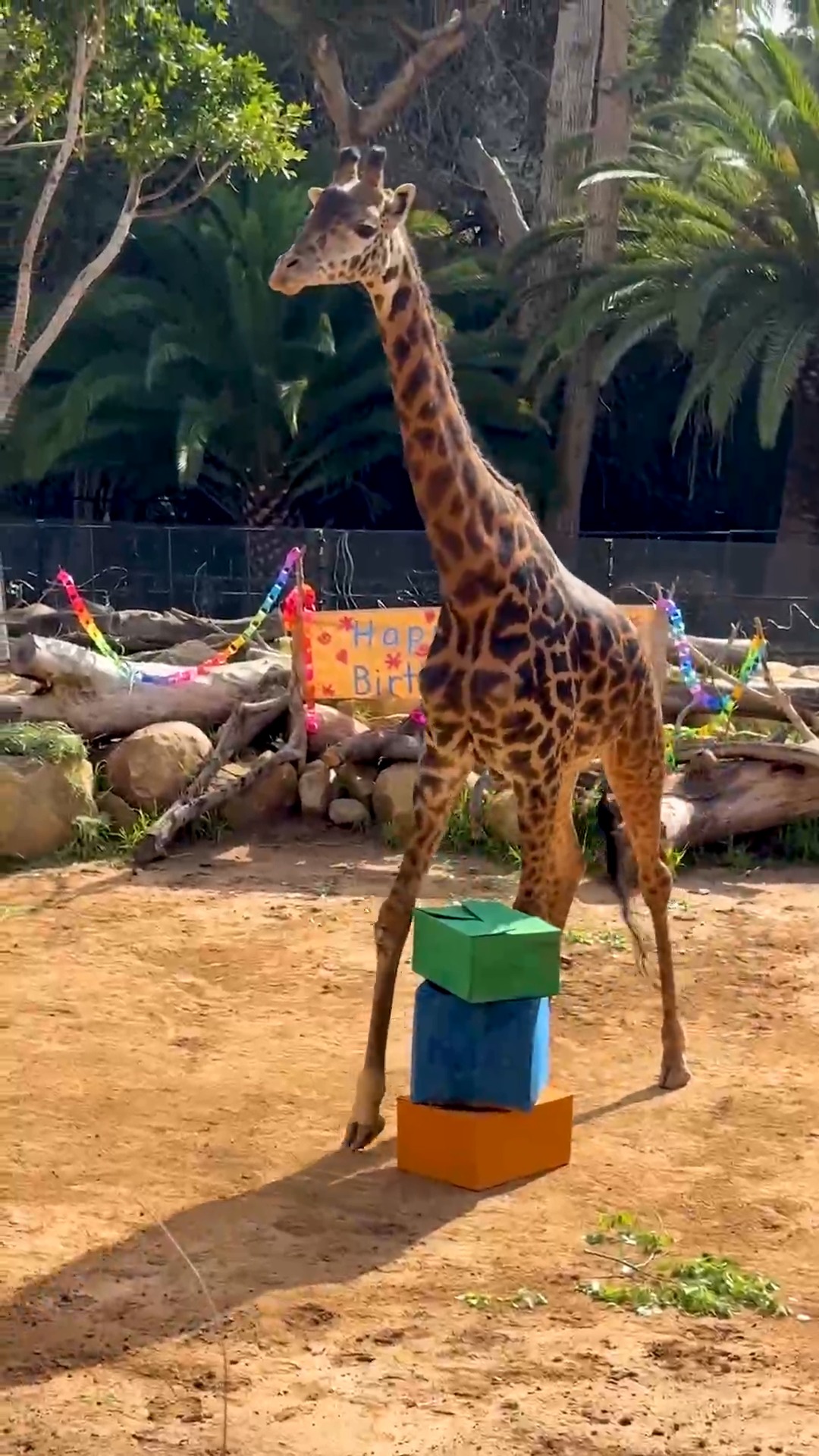 Alt-text: A reel showing Theo’s 6th birthday party at the Zoo. We see Theo and the rest of the Masai giraffe enjoying browse, “reading” his birthday banner, and smashing colorful cardboard box gifts.