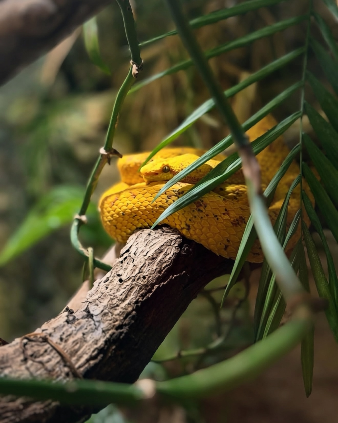 Meet the Eyelash Palm Viper, a small but mighty rainforest resident known for the fringe-like scales above its eyes that help break up its outline while it waits patiently for prey. Found in Central and South America, these arboreal vipers spend most of their time coiled on branches, perfectly camouflaged in shades of yellow, green, orange, or even red.