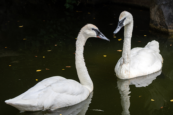 Webby and Dewey, the trumpeter swans at the Zoo, have been together for seven years. These swans are the largest waterfowl in North America, known for their trumpet-like calls. Webby came from a rehabilitation center, while Dewey came from an aviary. They are recognized by distinct physical traits and share a strong bond with their keepers. Trumpeter swans were once nearly extinct due to hunting but have rebounded thanks to conservation efforts, with populations now around 60,000. Webby and Dewey enjoy a diet of bugs and plants and are cared for in a newly renovated habitat. Their home includes a pond with a water wheel and bridge, providing a comfortable environment for this personable pair.