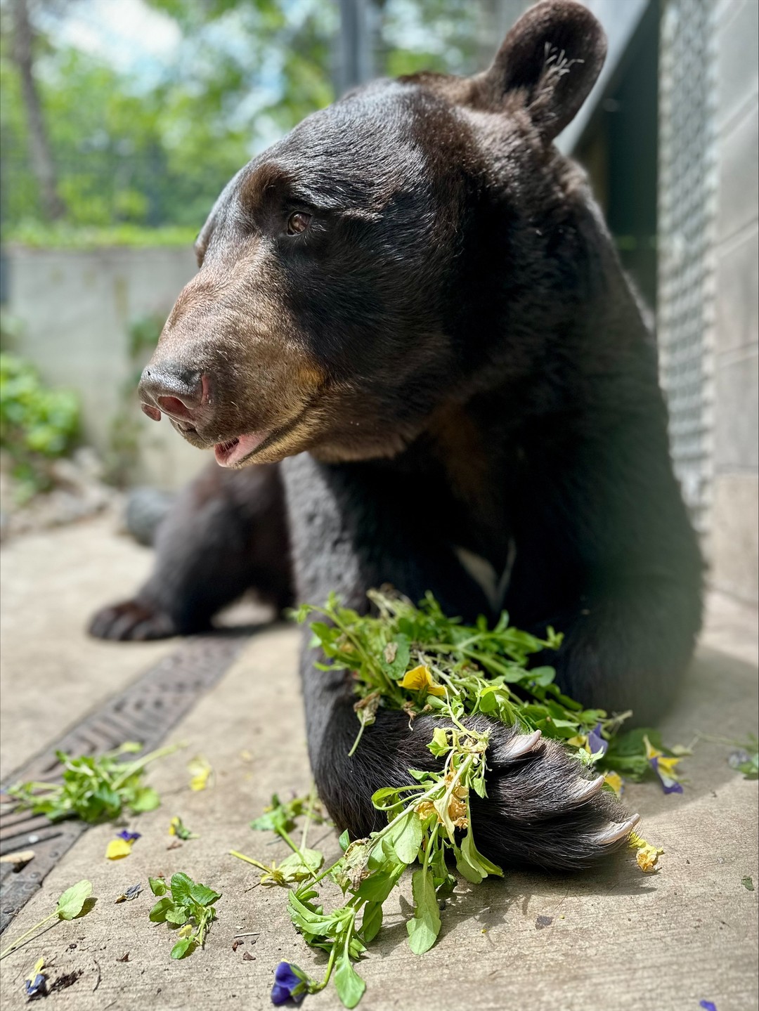 Turn up your volume and enjoy this sweet video of black bear Birch munching on a special snack! Black bears eat flowers and other vegetation in the wild, so these pansies were a perfect summer treat for them, courtesy of the Horticulture team. 💐