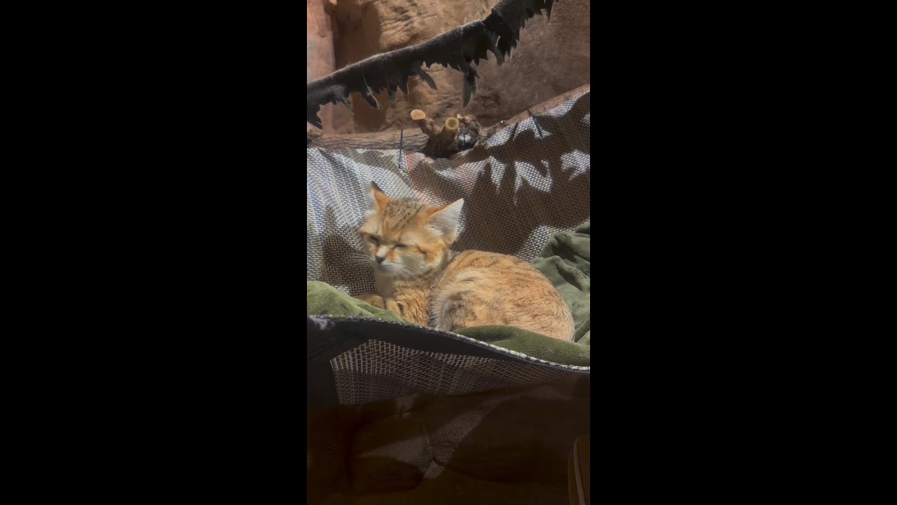 Sand cats are native to the dry deserts in the African Sahara. They often sleep in underground dens during the day to avoid the intense heat. This helps them conserve their energy for hunting at night! See if you can spot Solis snoozing on your next trip to Desert’s Edge!