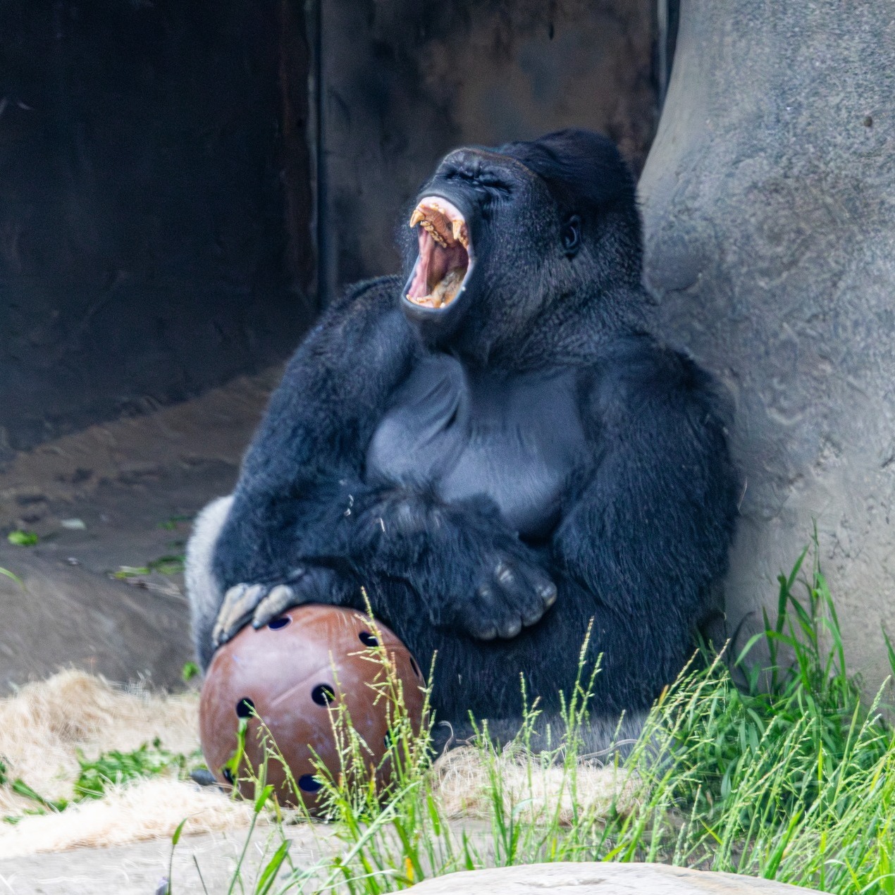 Alt-text: Bangori the Western lowland gorilla lets out a ferocious, excited scream-looking yawn while he clutches a puzzle feeder and lounges against a wall.
