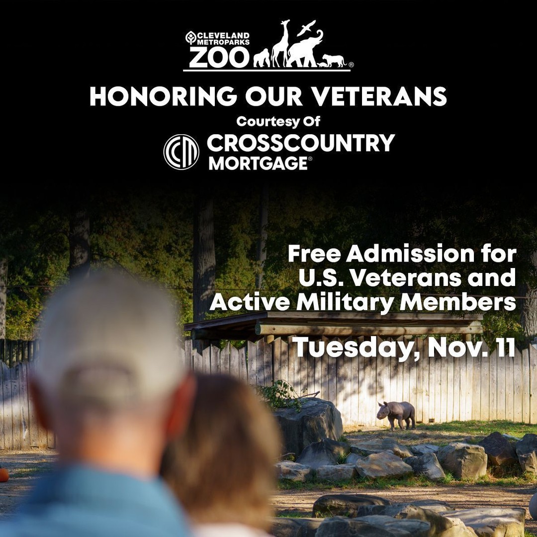 REMINDER 🇺🇸 U.S Veterans and Active Military get into the Zoo for FREE on Tuesday, November 11 courtesy of @crosscountrymtg. Those with valid military ID can also purchase up to 6 discounted tickets for family members.