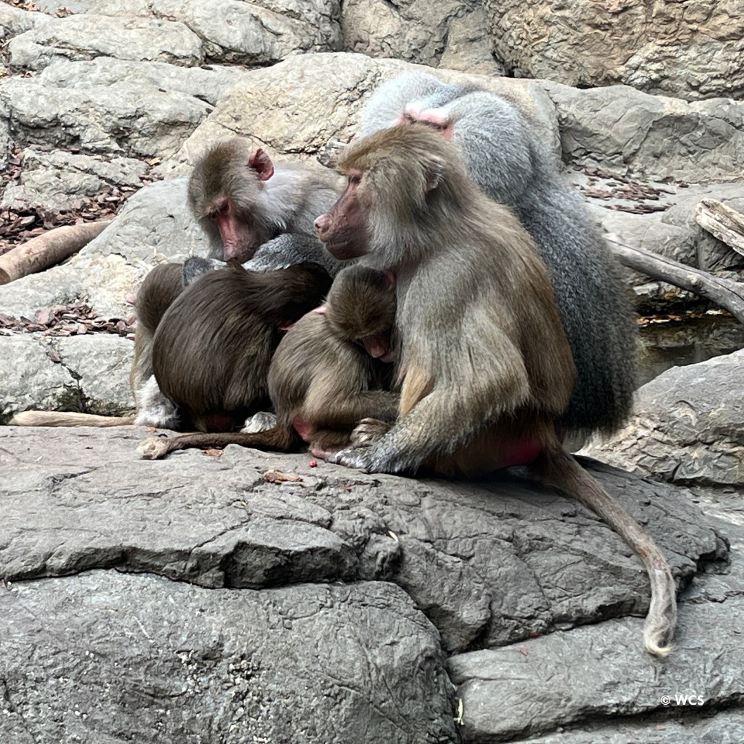 It’s a hot rock huddle! Our Hamadryas baboons are shown here huddled on artificial rockwork that has built-in heating elements which activate in colder weather. The Ethiopian highlands, their natural habitat, averages about 45 degrees during the day and drops to the mid 30s overnight, which is similar to our average winter conditions. While these baboons can withstand colder temperatures, we provide some “creature comforts” like these special rocks.