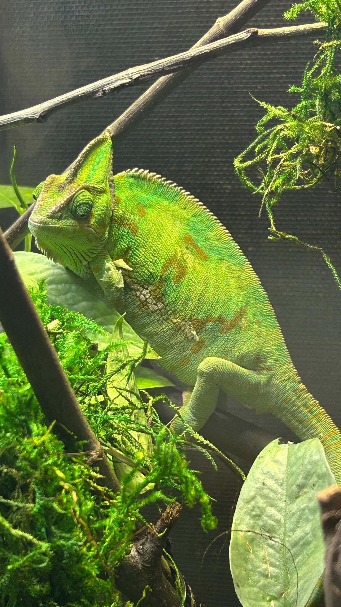 Meet Cleo, our gorgeous new veiled chameleon! She’s 4 years old, weighs 125 grams, and is a deadshot when it comes to catching crickets!