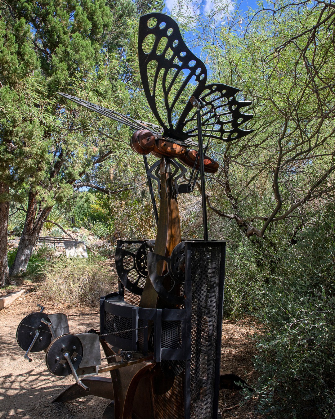 Crafted from motorcycle and bicycle parts, steel, and slabs of mesquite wood treated with linseed oil, Joe has shaped these materials into graceful forms. The results are a striking dragonfly, a butterfly, and a few other critters that capture the wonder of nature.