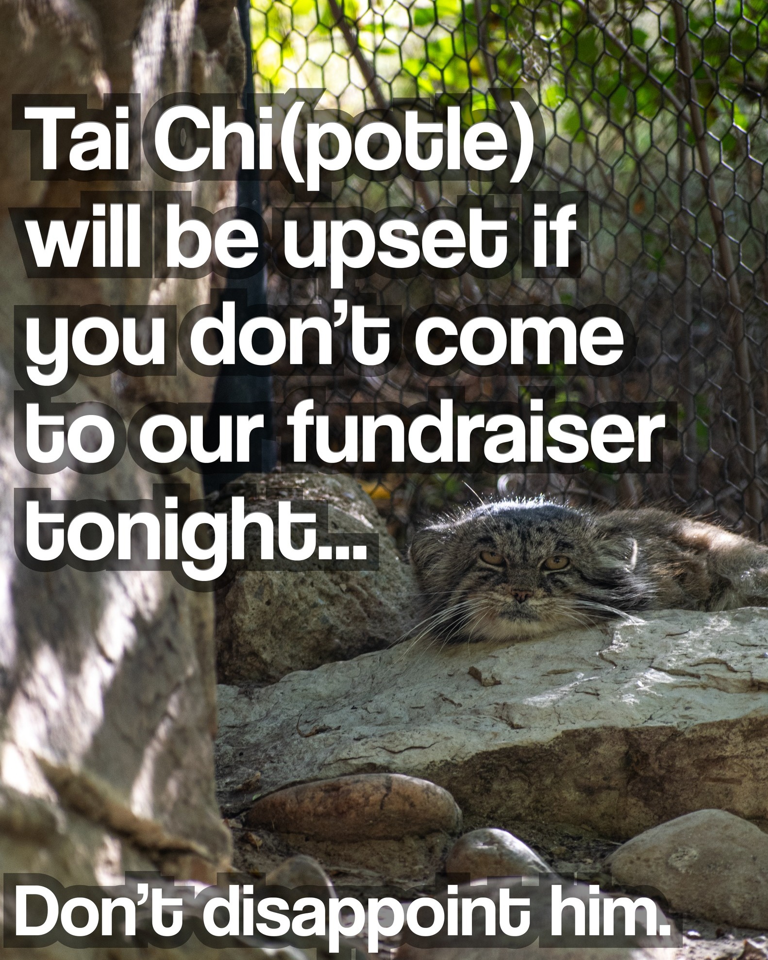 Tonight is the night of our Chipotle fundraiser! From 5:00 PM to 9:00 PM, 25% of sales will be donated to the Pueblo Zoo. We hope to see you there, Pueblo—you don’t want to disappoint Tai Chi after all.