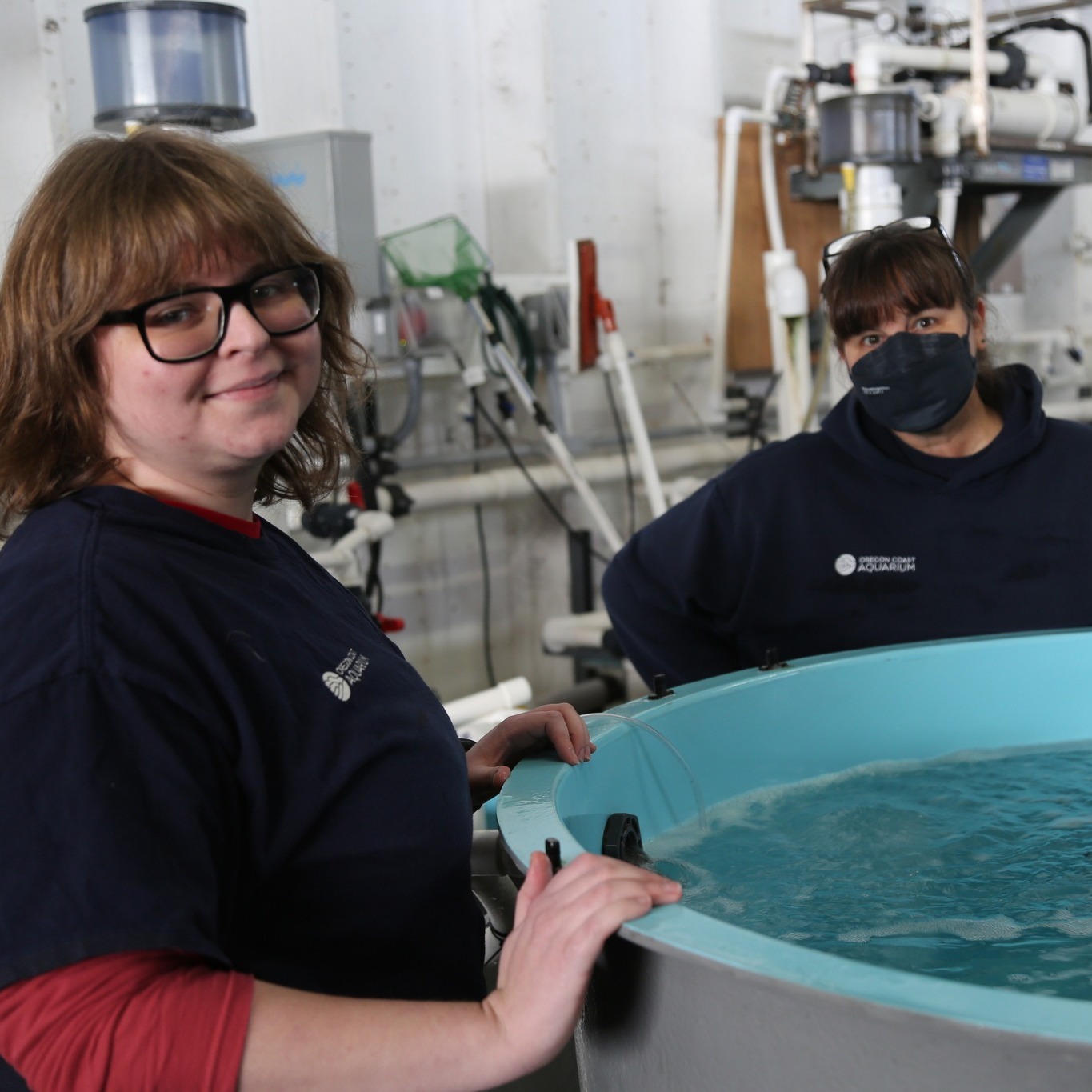📷: Aquarist Tiffany and Assistant Curator Evo stand near a tank of sunflower sea stars; Aviculturist Marie works with Pip the brown pelican; Animal Ambassador Care Specialist Devon admires Wilson the barn owl; Mammalogists Megan, Lauren, Danielle, and Becca work with the sea otters