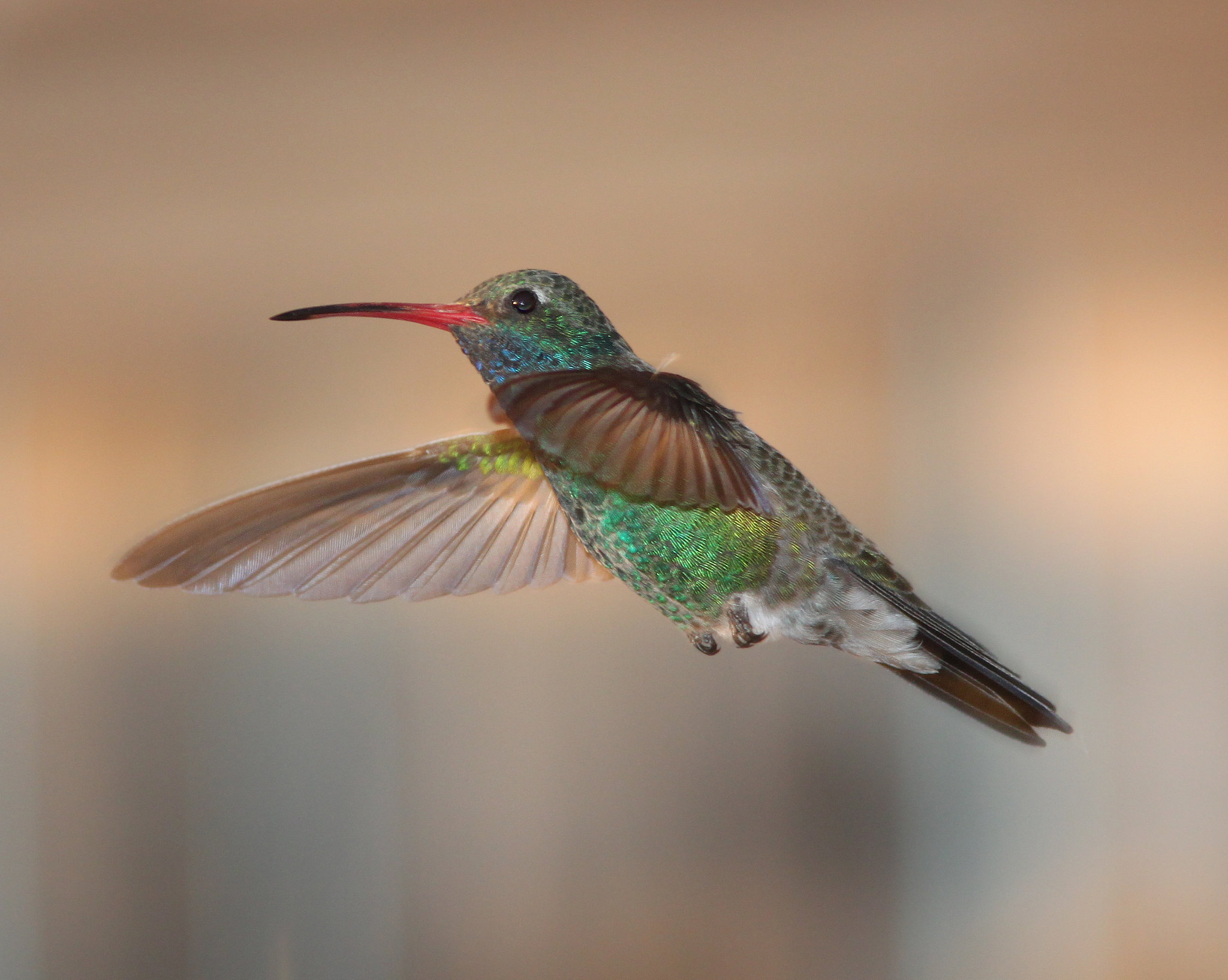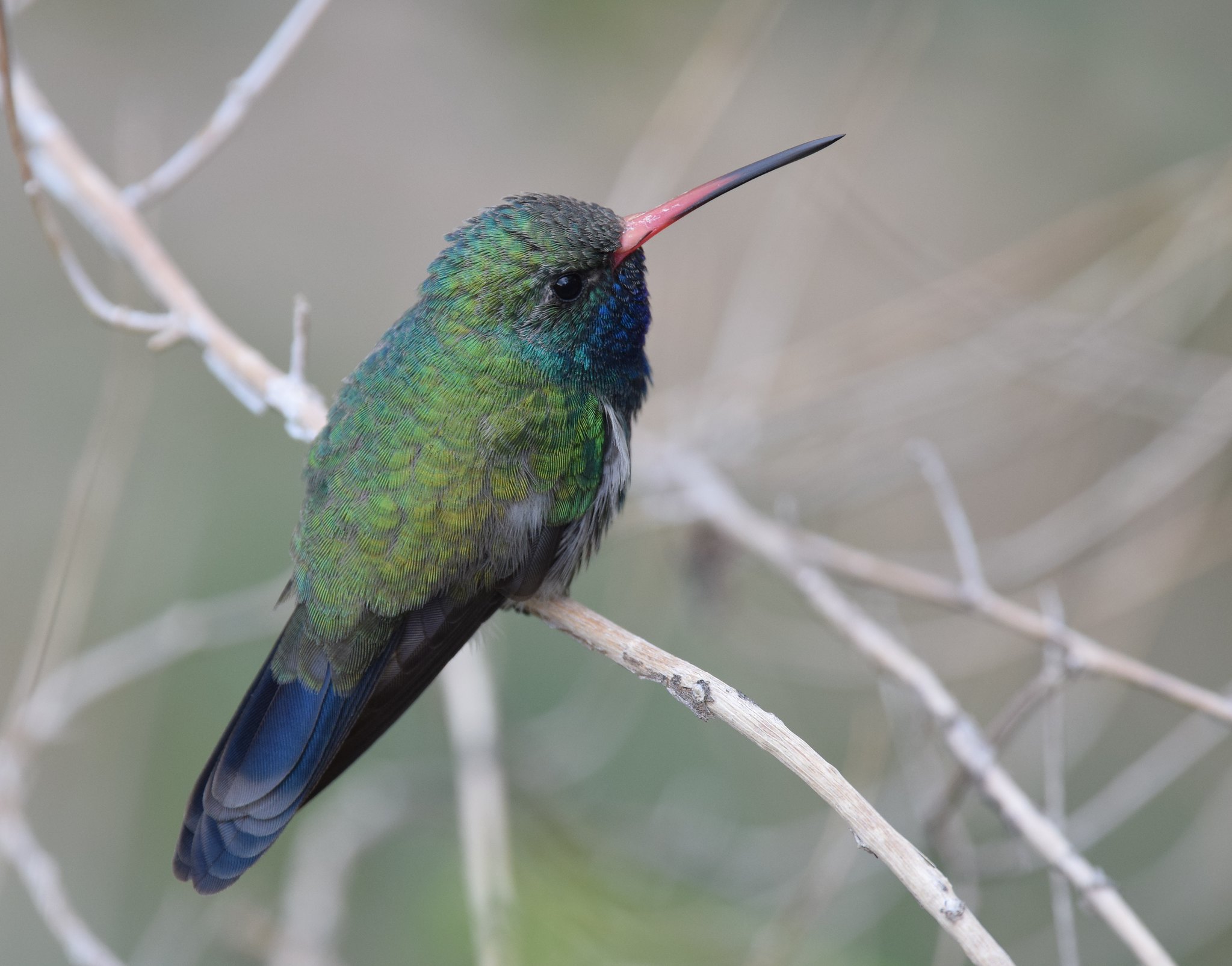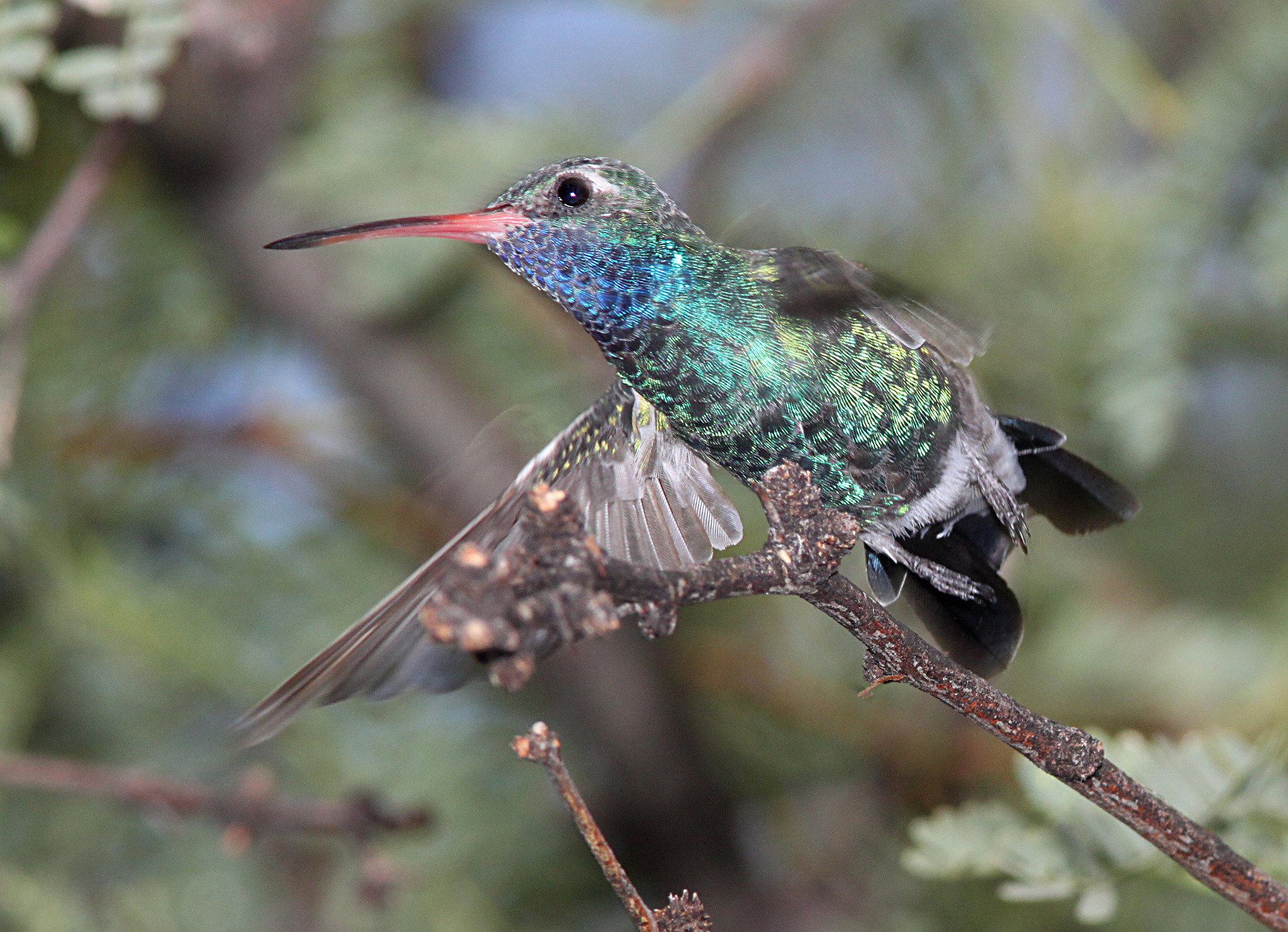 The Broad-billed Hummingbird is small, typically measuring about 3.5 inches long and weighing around 3-4 grams. Males are particularly striking, with iridescent blue throats and bright green backs and heads. Their underparts are mostly grey-white, starkly contrasting the vibrant upper body. The namesake broad bill is bright red with a black tip, making it one of the most distinctive features of this species.