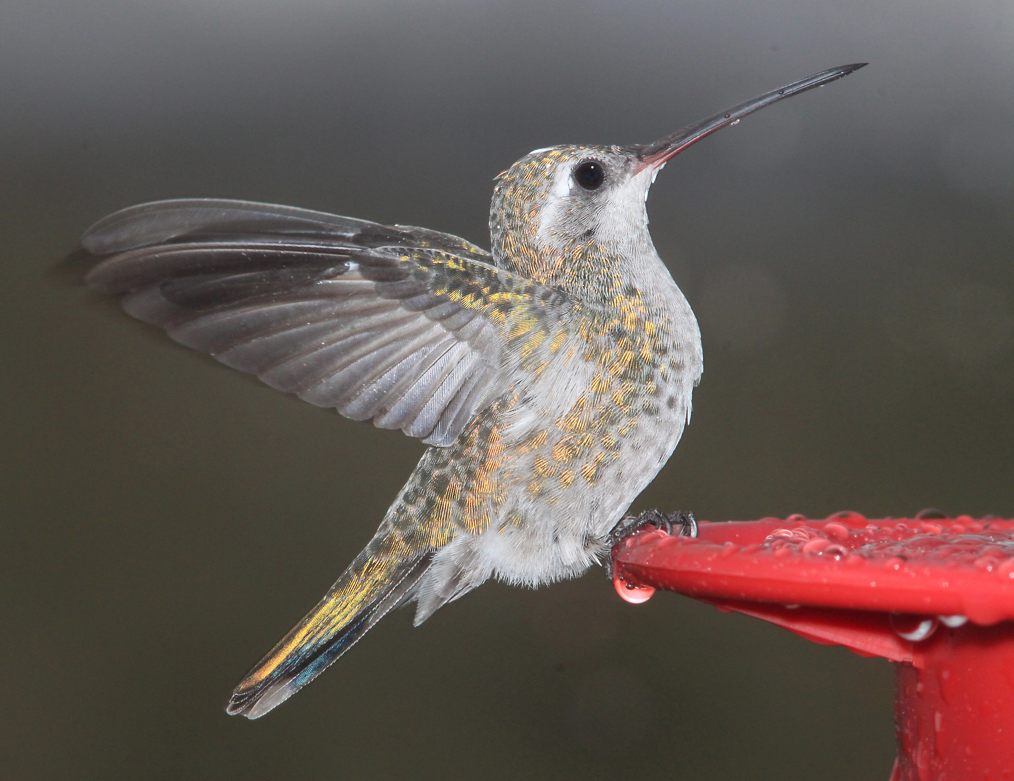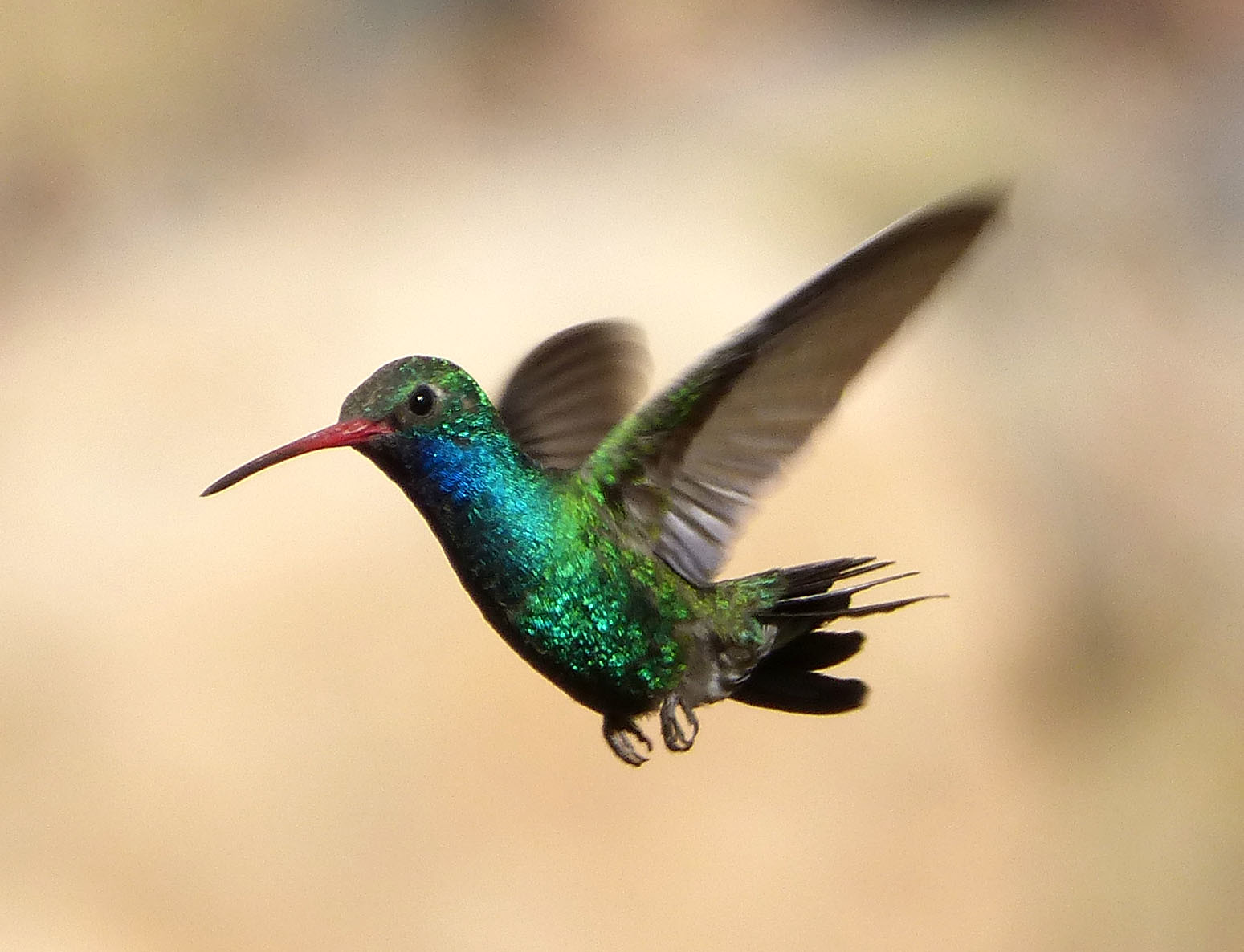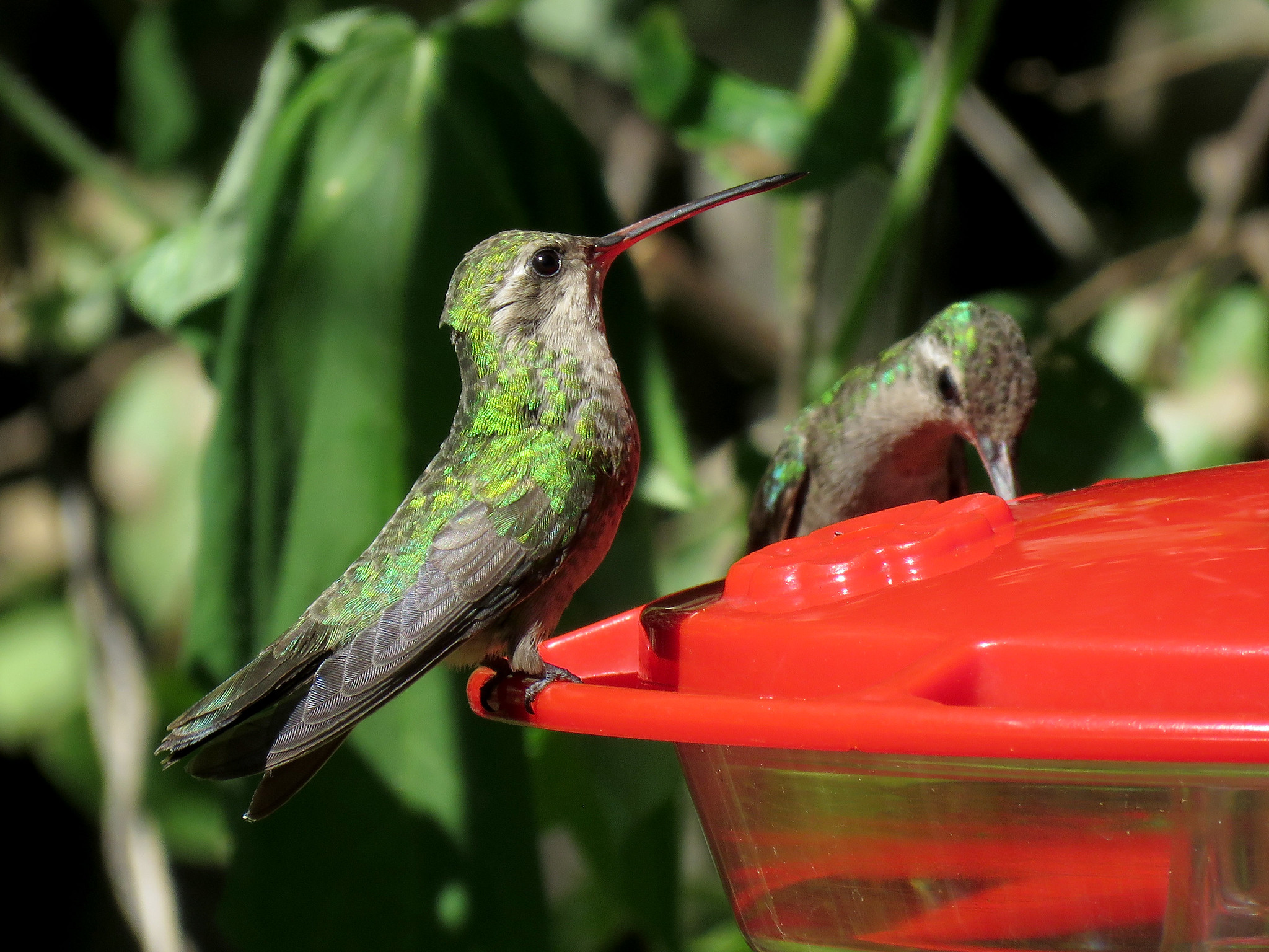 The Broad-billed Hummingbird is small, typically measuring about 3.5 inches long and weighing around 3-4 grams. Males are particularly striking, with iridescent blue throats and bright green backs and heads. Their underparts are mostly grey-white, starkly contrasting the vibrant upper body. The namesake broad bill is bright red with a black tip, making it one of the most distinctive features of this species.