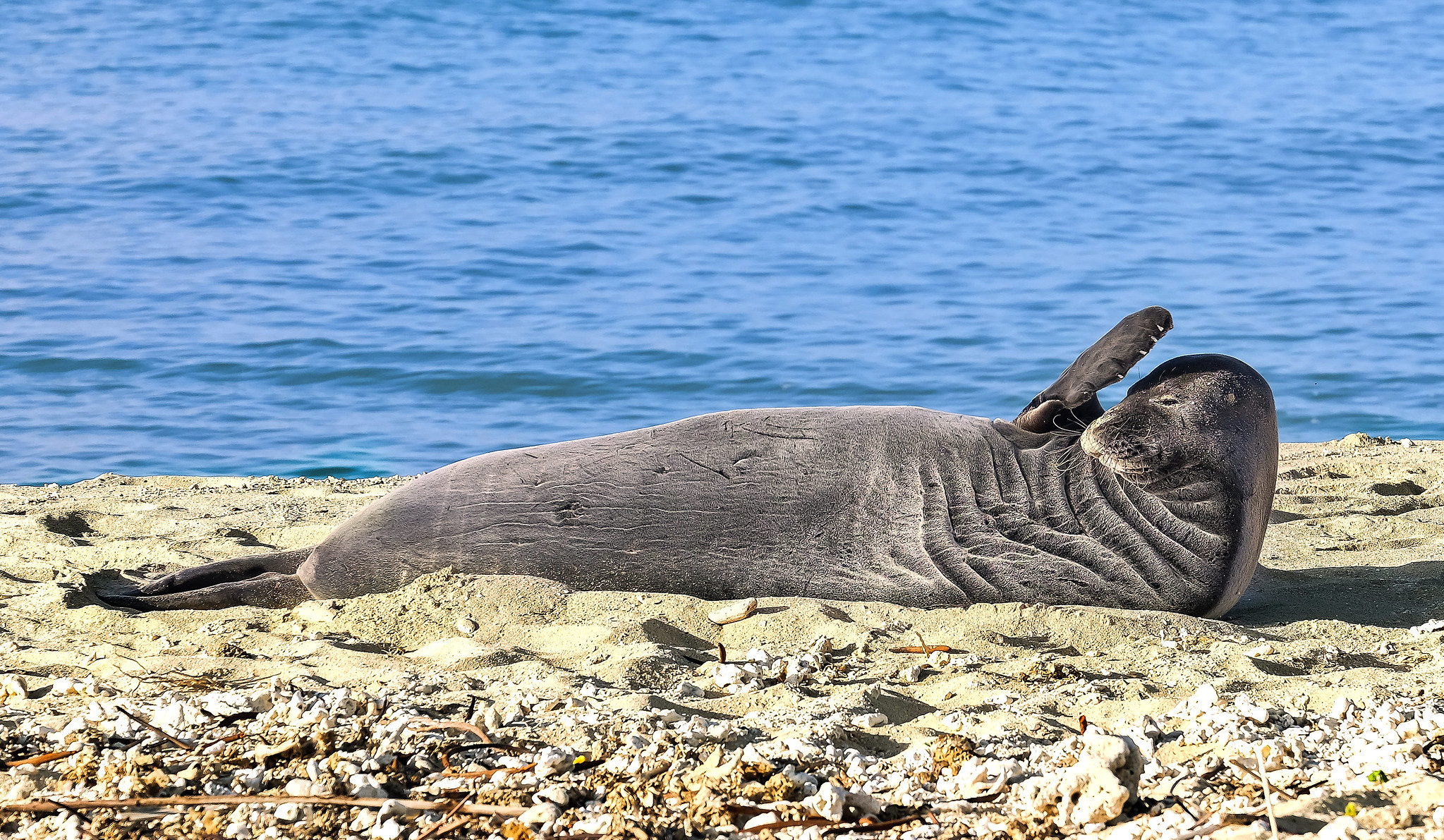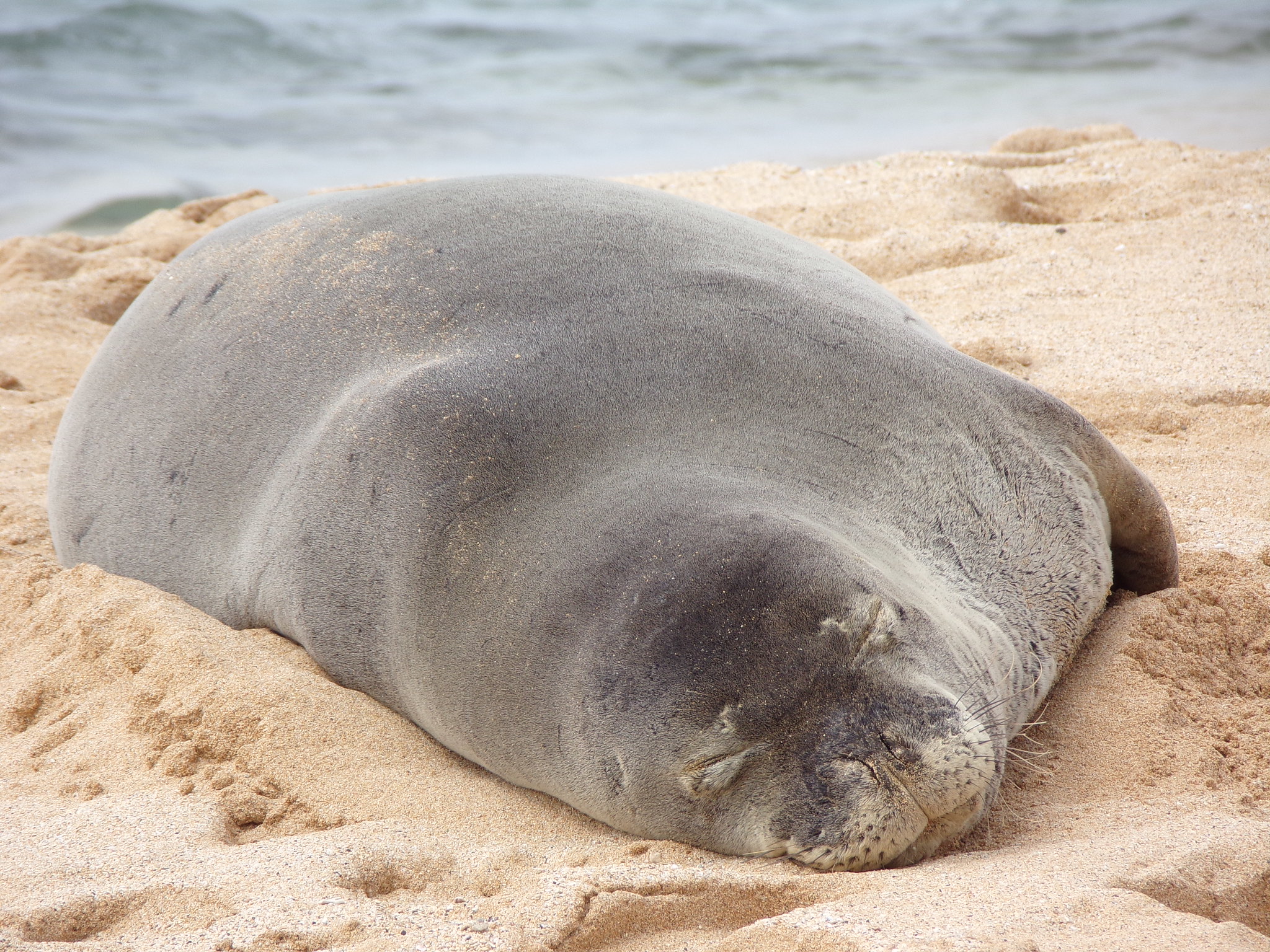 Hawaiian monk seals have a robust, spindle-shaped body with short foreflippers and strong hind flippers adapted for aquatic propulsion. Coat color is generally gray to brown above, with a lighter underside, and individuals often show scars from social interactions, predators, or entanglements. The head is relatively small with large dark eyes and prominent whiskers used for sensing prey and navigating in low light. Females are typically slightly larger than males, and pups are born with a dark natal coat that is later replaced by a sleeker juvenile pelage.