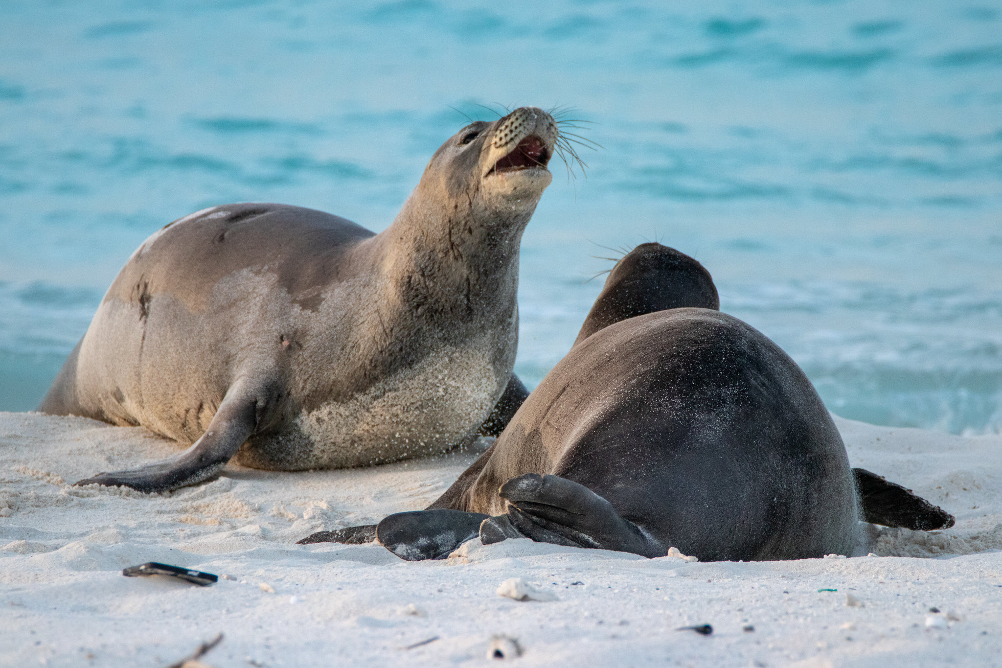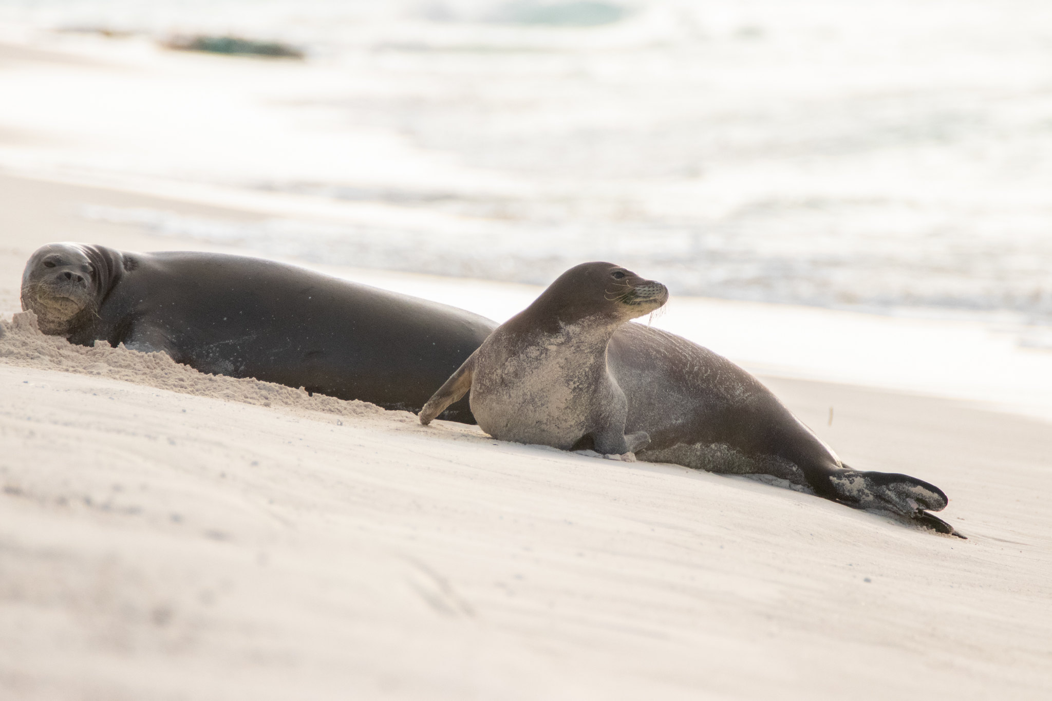 Hawaiian monk seals are generally solitary, especially at sea, where they forage alone and do not form stable pods or coordinated hunting groups. On land, they may haul out in loose aggregations when suitable beaches are limited, but these groupings are typically temporary and not structured like permanent colonies in some other pinnipeds. Social interactions include vocalizations, posturing, and occasional aggressive encounters, with males more often involved in competitive behavior during the breeding period. Mothers and pups form the most consistent social unit, with strong maternal investment until weaning.
