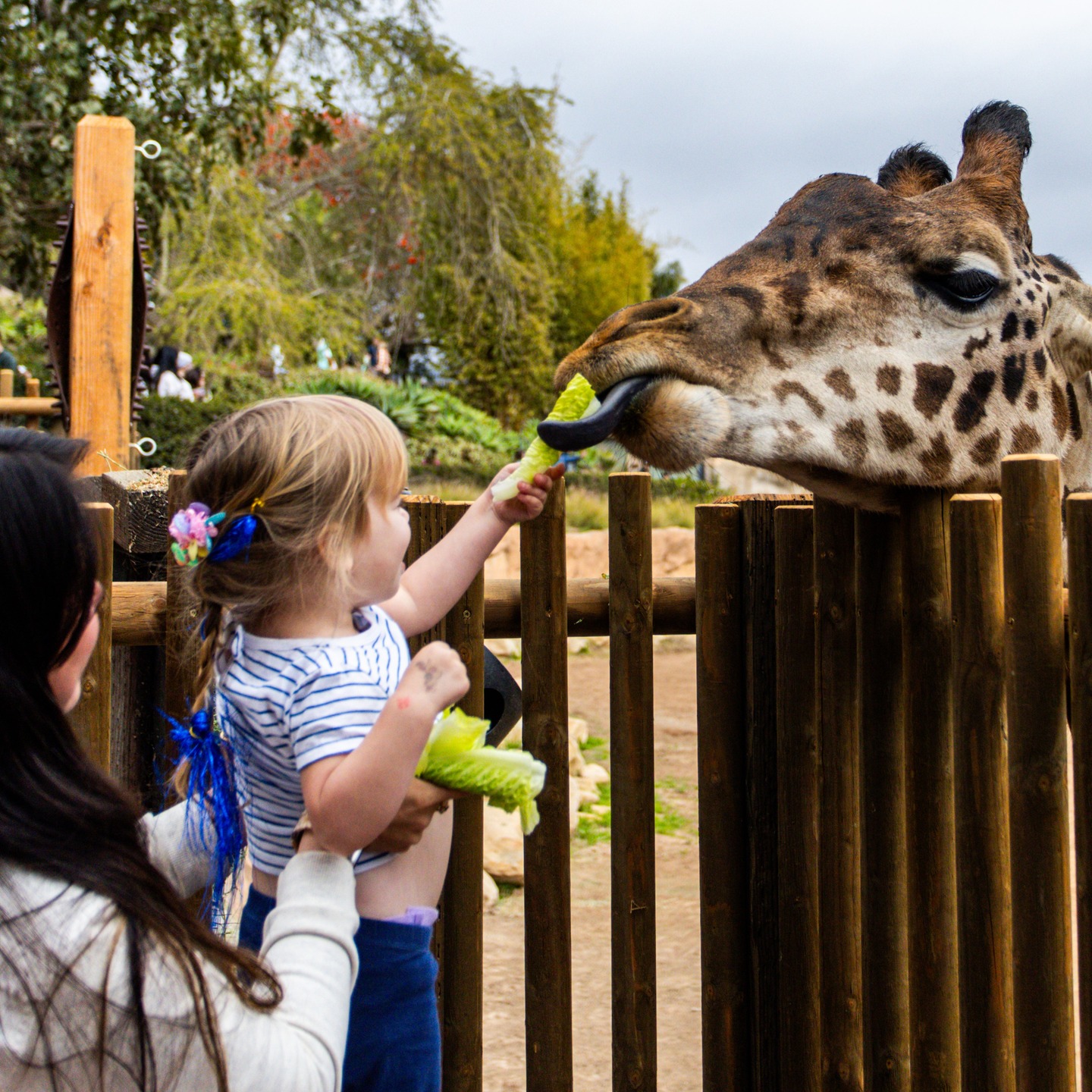 Alt-text: A young family extends a token of friendship (a leaf of lettuce) to Theo the Masai giraffe at the recently refreshed giraffe deck.