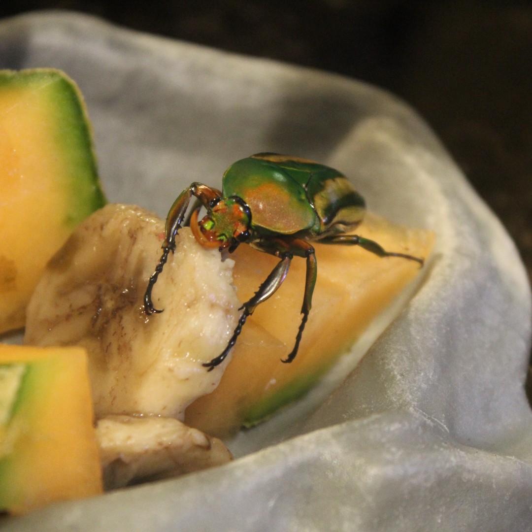 Now on display at Butterfly Pavilion, meet our adorable Flamboyant Flower Beetles! Native to the rainforests of Africa, these colorful beetles are important pollinators for the flowers in their ecosystem. You can tell the males apart by their distinct Y-shaped horns, while females sport a shovel-like tusk. Can you spot which is which in these photos?