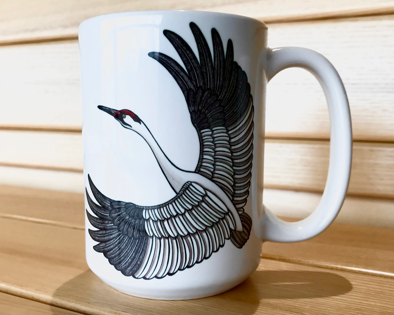 The Whooping Crane, Grus americana, stands prominently as a symbol of wildlife conservation. Its depiction on the new 15-ounce mug designed by Wisconsin artist Kim Russell serves as both an artistic endeavor and a beacon of environmental awareness. The graceful imagery of this bird in flight captures attention and fosters appreciation for the delicate balance of ecosystems. Kim Russell’s artwork invites viewers into a narrative that links art to conservation efforts, bridging visual appeal with environmental consciousness.
