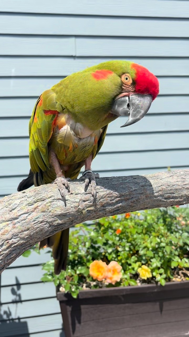 Nico, a red-fronted macaw, is munching on a peanut – his special snack for World Parrot Day! 🥜
