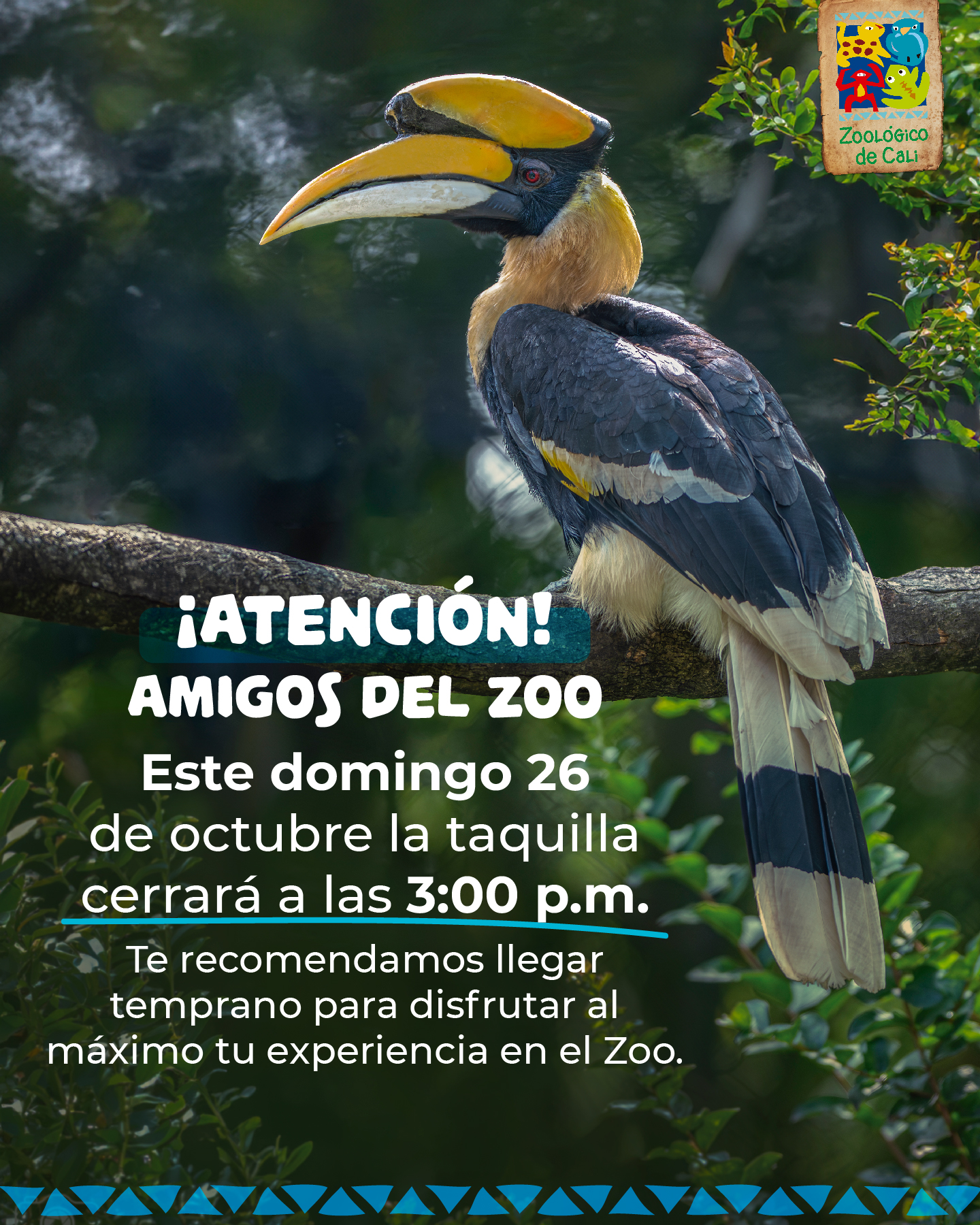 Este domingo 26 de octubre la taquilla cerrará a las 3:00 p.m. Te recomendamos llegar temprano para que disfrutes sin prisa de toda la magia, la naturaleza y las experiencias que te esperan en el ZooCali. 🌿
