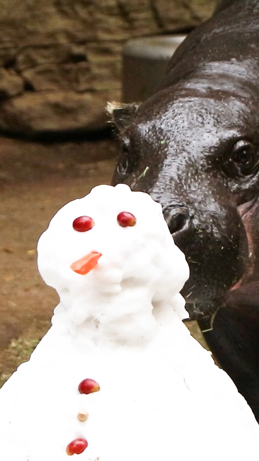 With plenty of snow still OUTSIDE, Keeper Natalie brought some snow INSIDE for Inocencio pygmy hippo. ⛄️ It took him a little while to “warm up” to his snowman.