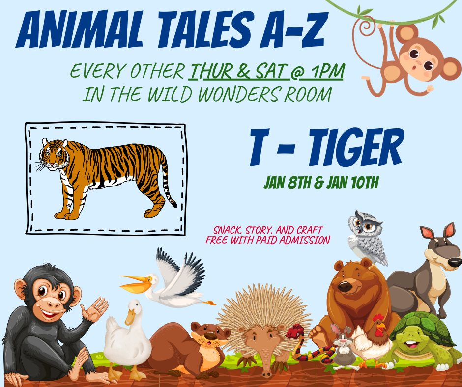 Next Thursday and Saturday, January 8 and 12, enjoy a story, snack, and craft based on tigers as part of regular zoo admission.