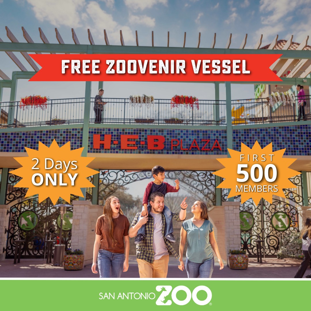 Join us on Saturday, May 17, or Sunday, May 18, and be among the first 500 Members each morning to receive a FREE Zoovenir Vessel voucher, redeemable inside H-E-B Plaza.