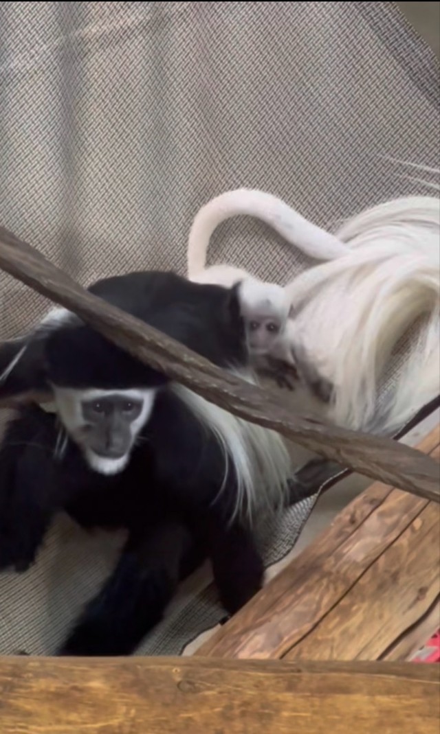 Nearly two-month-old baby colobus monkey Basil has started jumping, climbing, and exploring with his troop 🥰