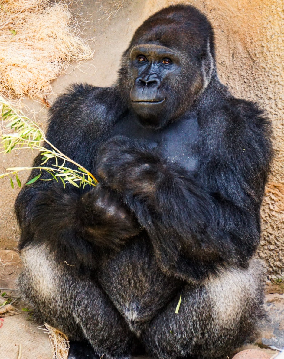 Alt-text: Nzinga the Western lowland gorilla smirks at Keeper Ariel’s camera as he crosses his arms while holding a bit of green leafery.