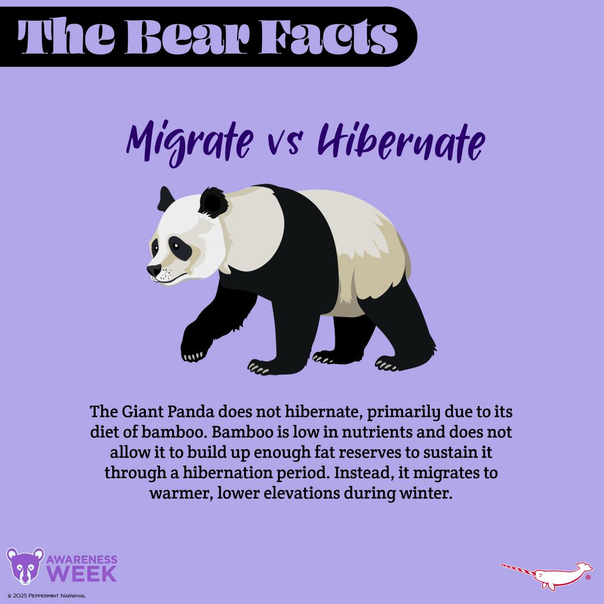 The Bear Facts – The Giant Panda does not hibernate primarily due to its diet of bamboo. Bamboo is low in nutrients and does not allow it to build up enough fat reserves to sustain it through a hibernation period. Instead, it migrates to warmer, lower elevations during winter.