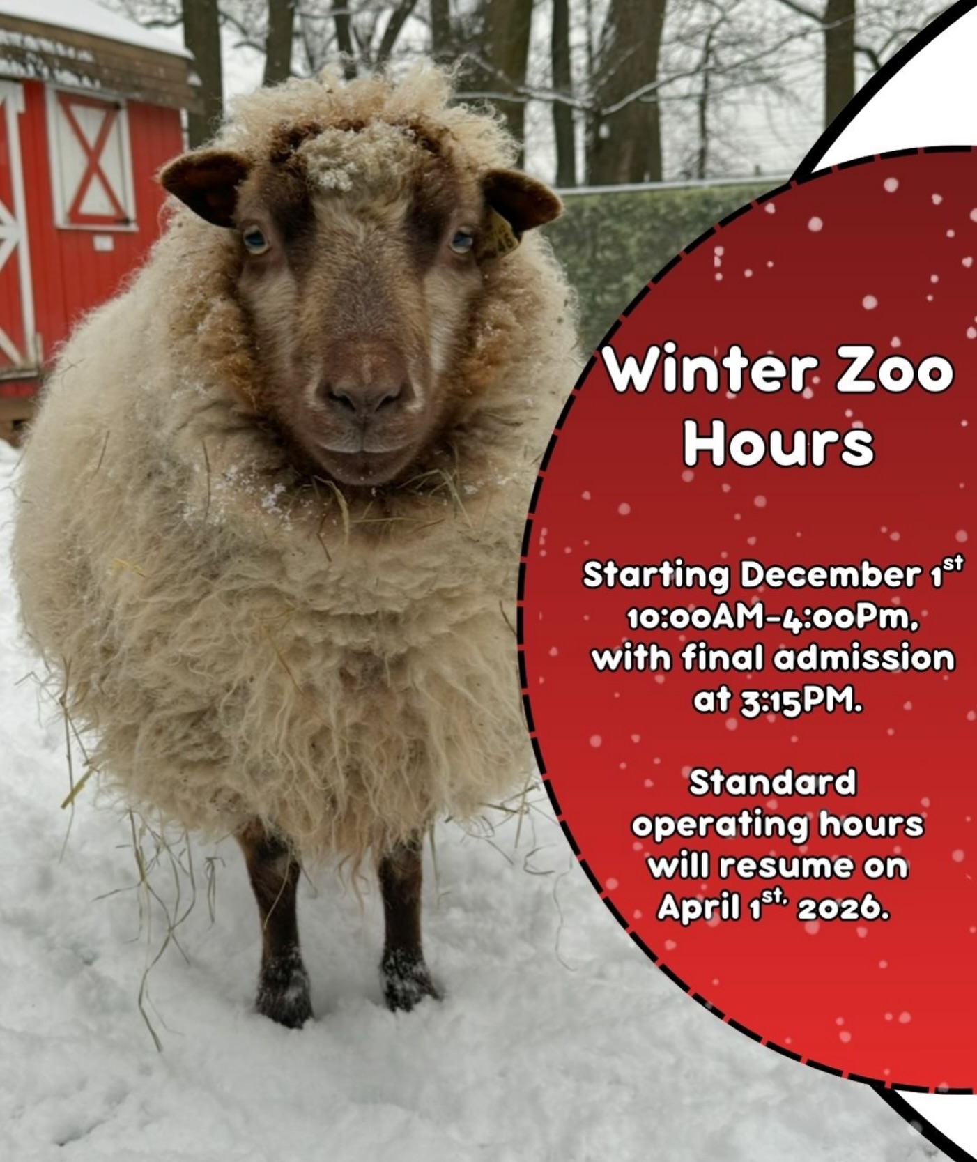 As winter settles in, we’re updating our schedule to match the season. Beginning December 1st, 2025 through April 1st, 2026, the Zoo will transition to our new winter hours of 10AM–4PM. This change helps us keep both guests and staff safe, comfortable, and able to enjoy the Zoo at its best. Thank you for sticking with us through every season! ❄️⛄️🥶