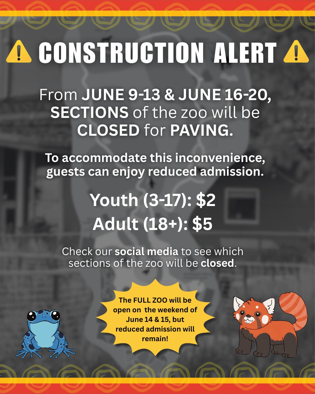 From JUNE 9-13 & JUNE 16-20, SECTIONS of the zoo will be CLOSED for PAVING.